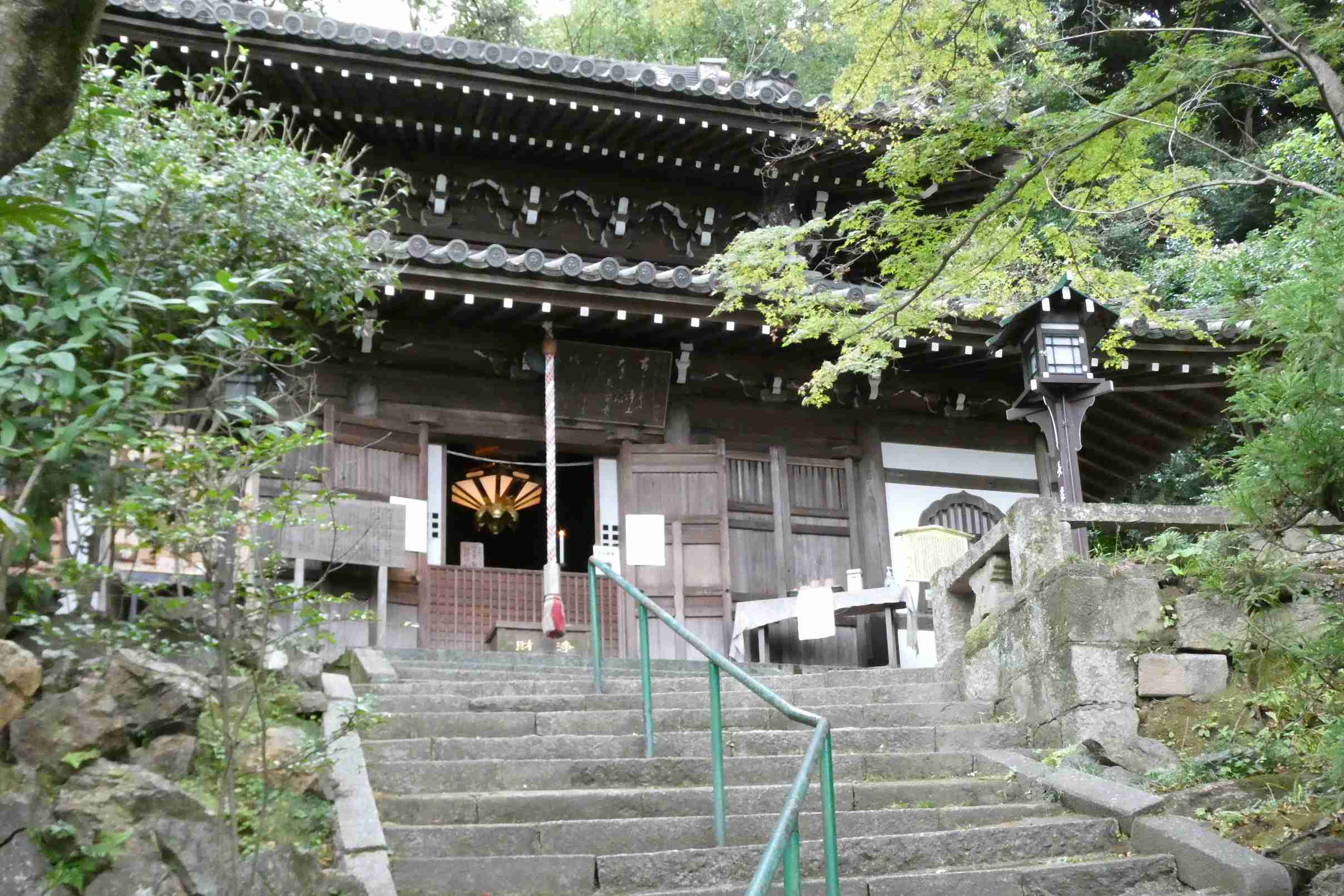 江戸時代のこの光景は今や見られない 現在の「本堂」(図中央、図では「観音堂」の位置にある)は明治23年(1890)正伝寺から移築されたものだし、現在の「書院」(図左端)、「相阿弥庭」(図では観音堂の左下)も明治時代に手が入っている 説明に「当山から二葉山が見える」とあるから、左の山は御生山か(もっと遠いはずですが) |
