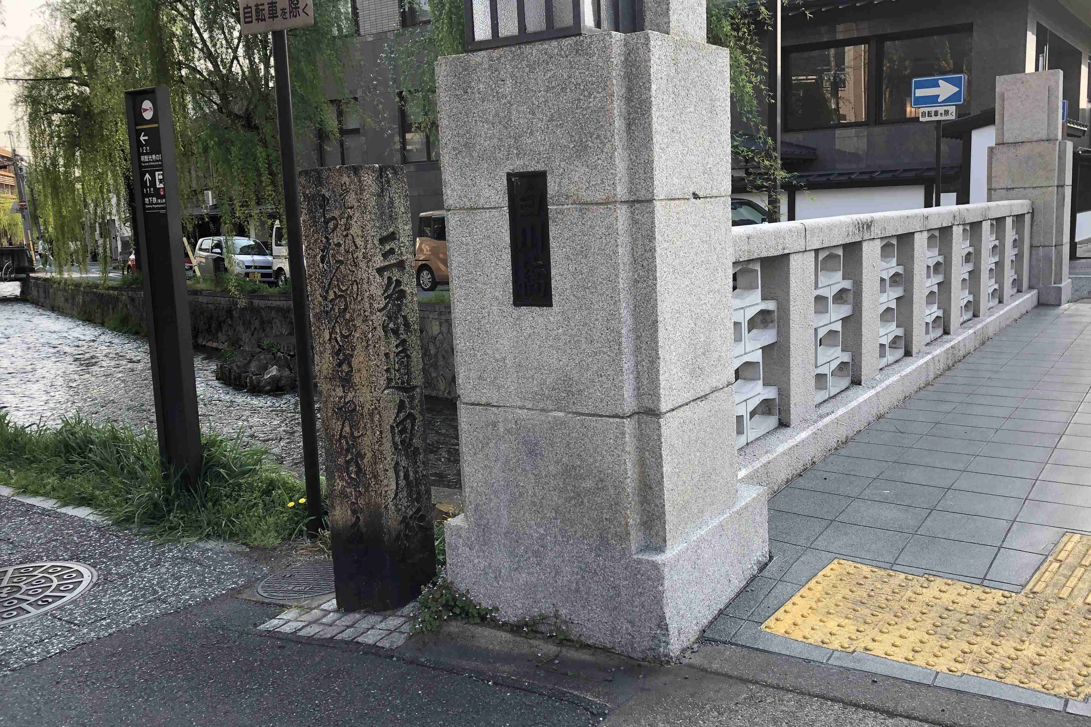 | 京都の現存最古の道標があり「是より左 知恩院 祇園 清水道」「三条通白川橋」と刻されている | 江戸時代に石橋として架橋された。現在の橋は明治45年(1912)のもの。橋+祇園を撮影する観光客で溢れている |