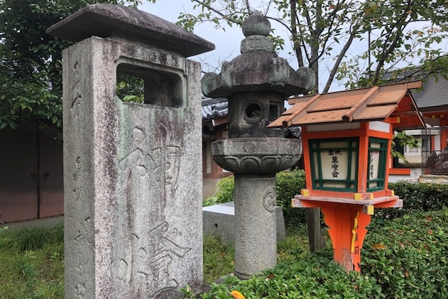 | 京都の町中に「車石」の一片が置かれている(展示のためらしい) | 元々は「舞殿」の東に置いてあったが、混雑回避のため「南楼門」の外に移された。「神燈」とある | 以前は寺の門前の六角通にあったが、明治初期に境内へ移された |