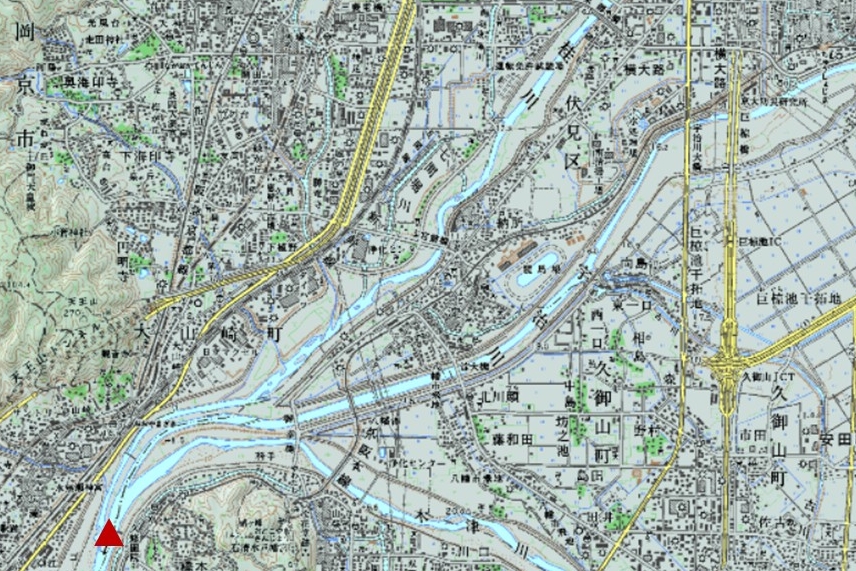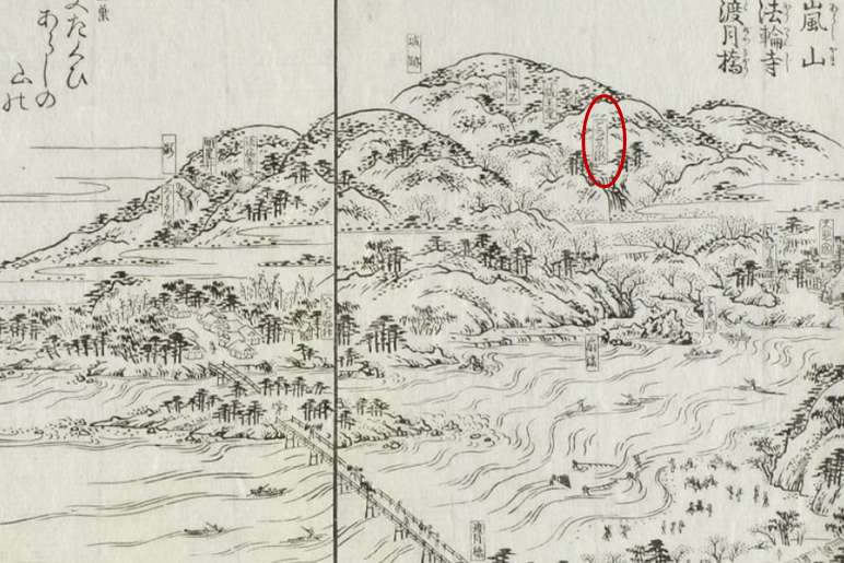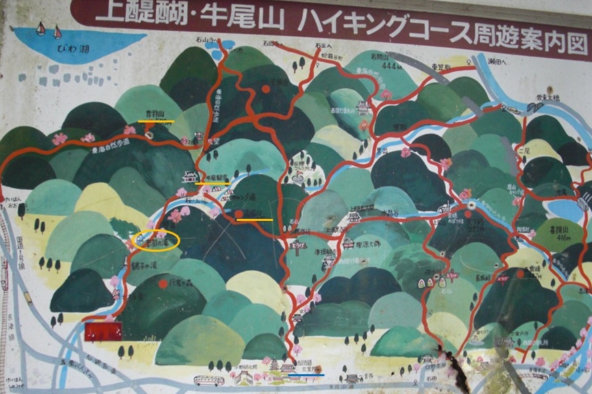 | 都名所図会にも描かれている。「嵐山城跡」「座禅石」「蔵王堂」の下にあり、戸難瀬滝は「千鳥ヶ淵」へ落ちている | 「音羽山」と「高塚山」の谷間に、「牛尾観音」と「音羽滝」(黄丸)がある | 南禅寺「駒ヶ滝最勝院」(高徳庵)の「奥の院」の背後にある |