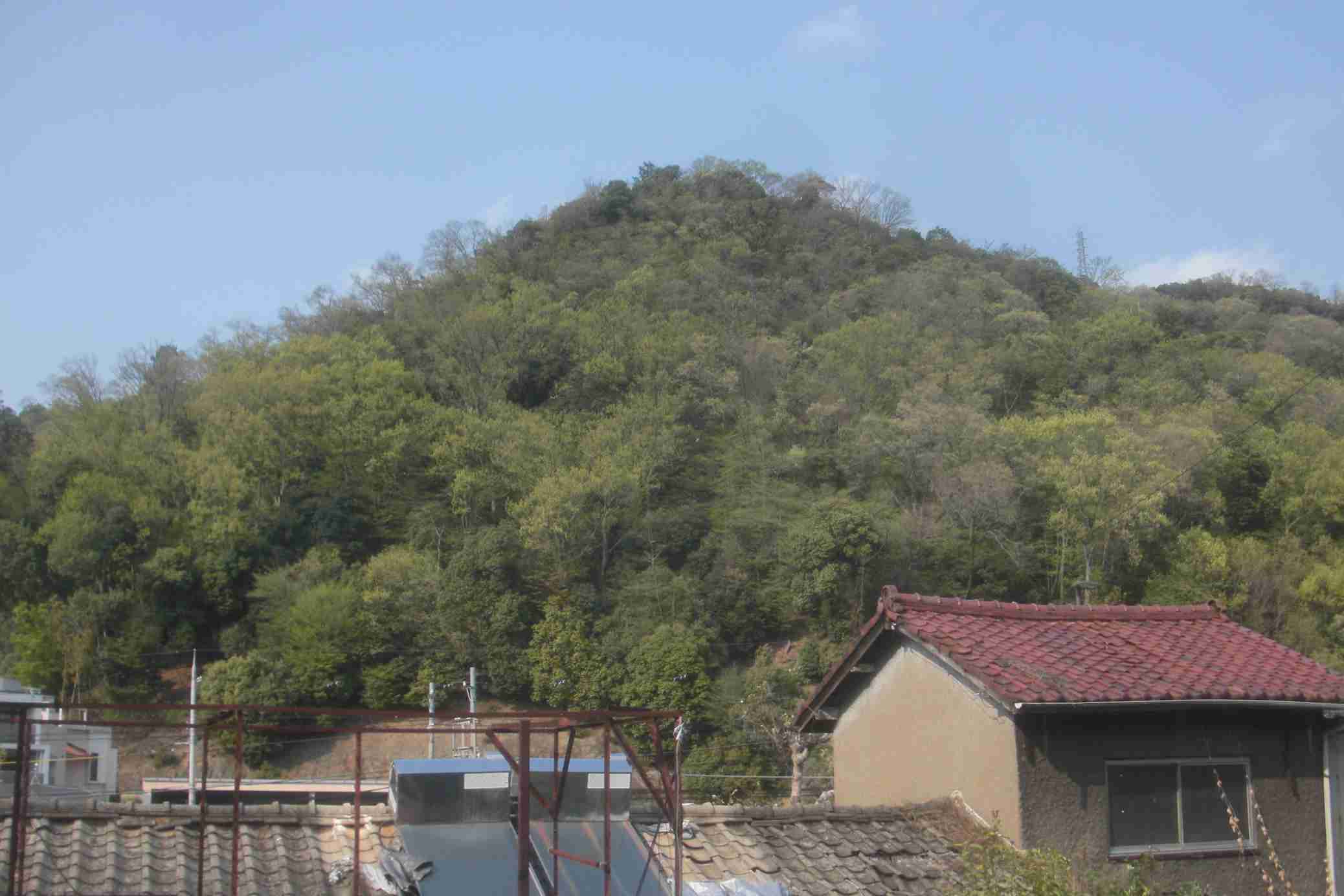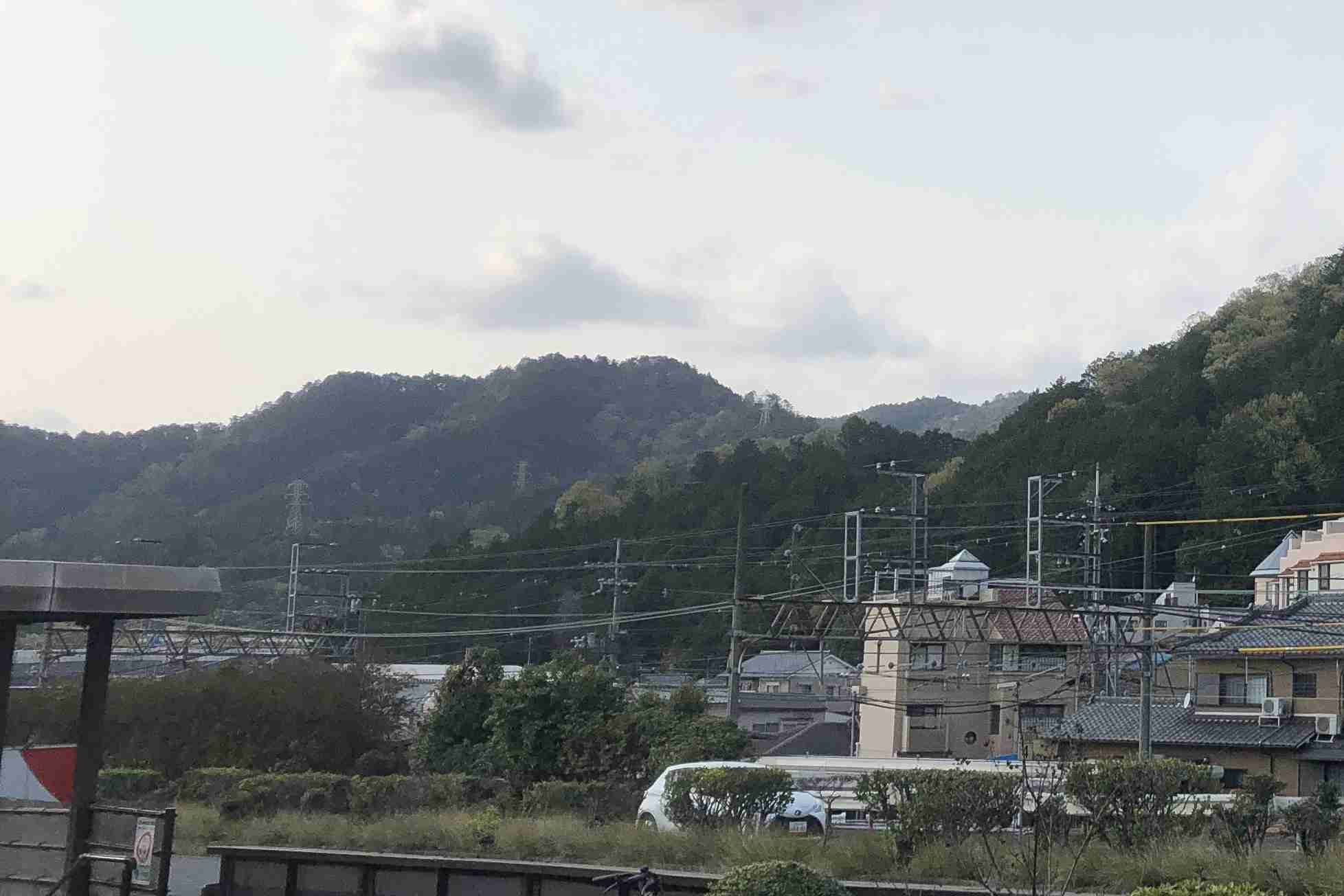| 京津線追分駅の北側に見える山。諸羽山と思われる(100%の自信は無いが) | 京津線追分駅の北西方向に「今熊野山、六条山、阿弥陀ヶ峰」の山群が見える。六条山がどれかは判然としない |