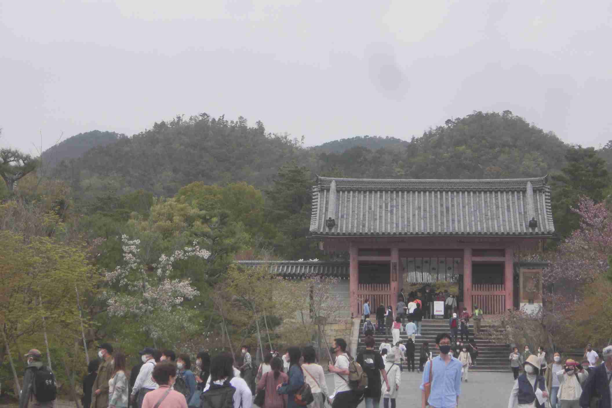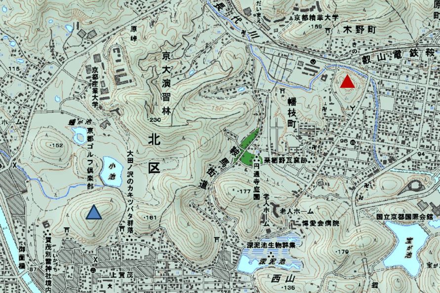 | 仁和寺の中門の後に見える山々。ピークが4つあって、どれが「大内山」かは明確でない | 赤△=岩倉五山の一つと言われる「一条山」 青△=片岡山 |
