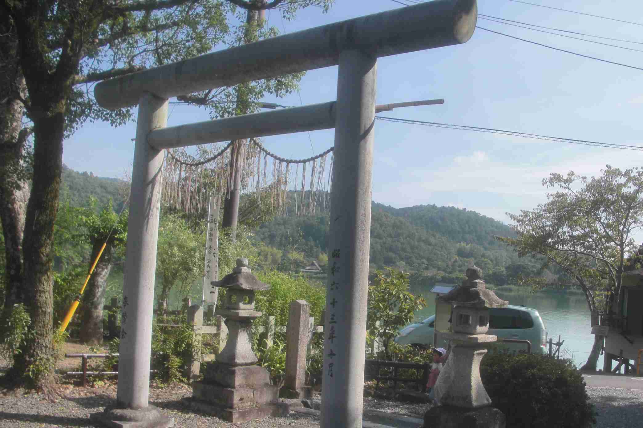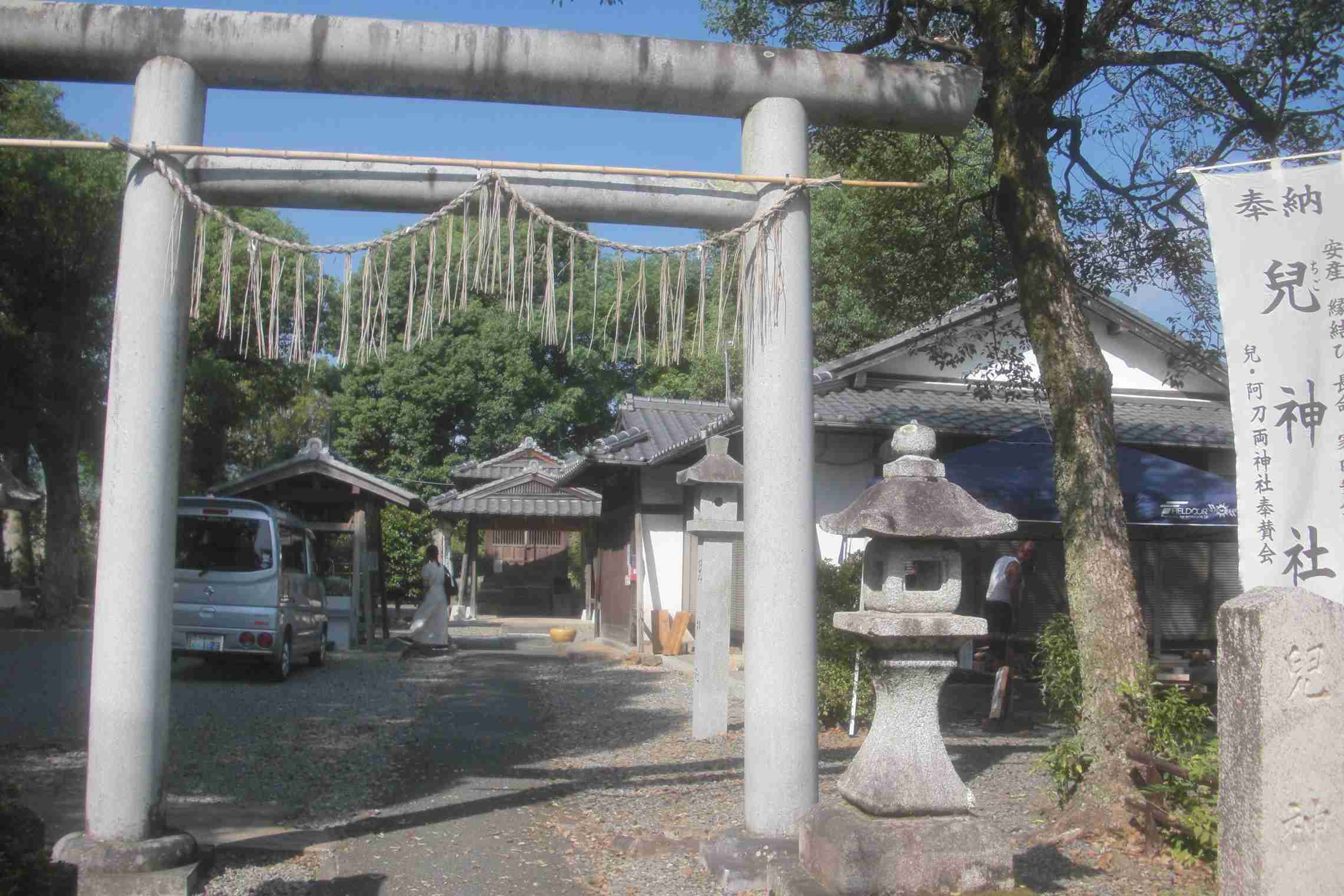 | 難しい「兒神社」の字が使われている | 「児神社」境内から見る「広沢池」 | 「児神社」境内に埋もれた「千代の古道の石碑」 |