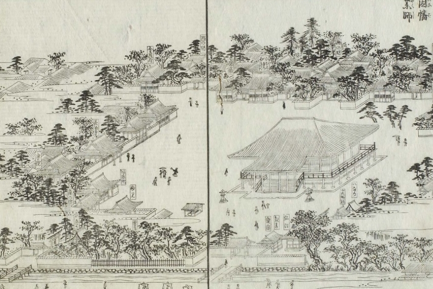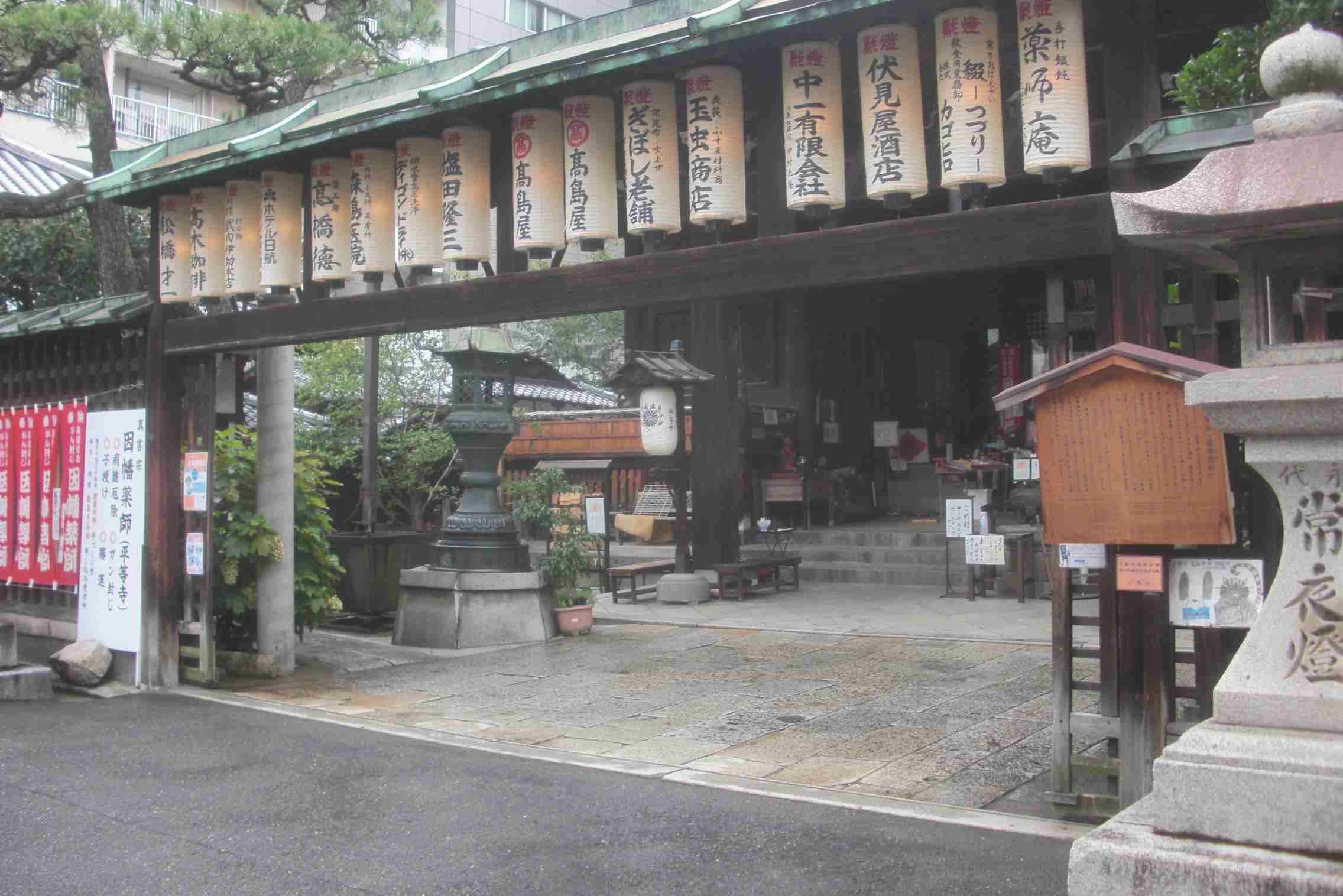 | 「本堂」(薬師如来)が正面にどんと坐っている | 「観音堂」は「本堂」の左奥に少し見える | 都名所図会では、「観音堂」に「阿弥陀」と書いてある |