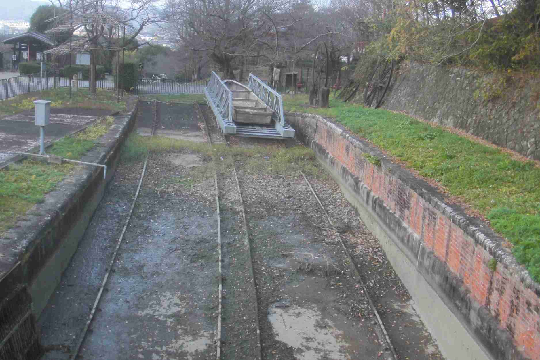 | 水路閣は琵琶湖疏水を「疏水分線(北に向かって流れる)」へ「水を流す水路橋」。今なお現役 | 琵琶湖疏水の水運を使って移動する「船」を京都の町に「陸路で運ぶ施設」。現在は静態保存 | 第二隧道は「水路上で最も短く」約124m。第三隧道は山科区日ノ岡堤谷町、第一隧道は最も長く約2,436m。いずれも現役 |