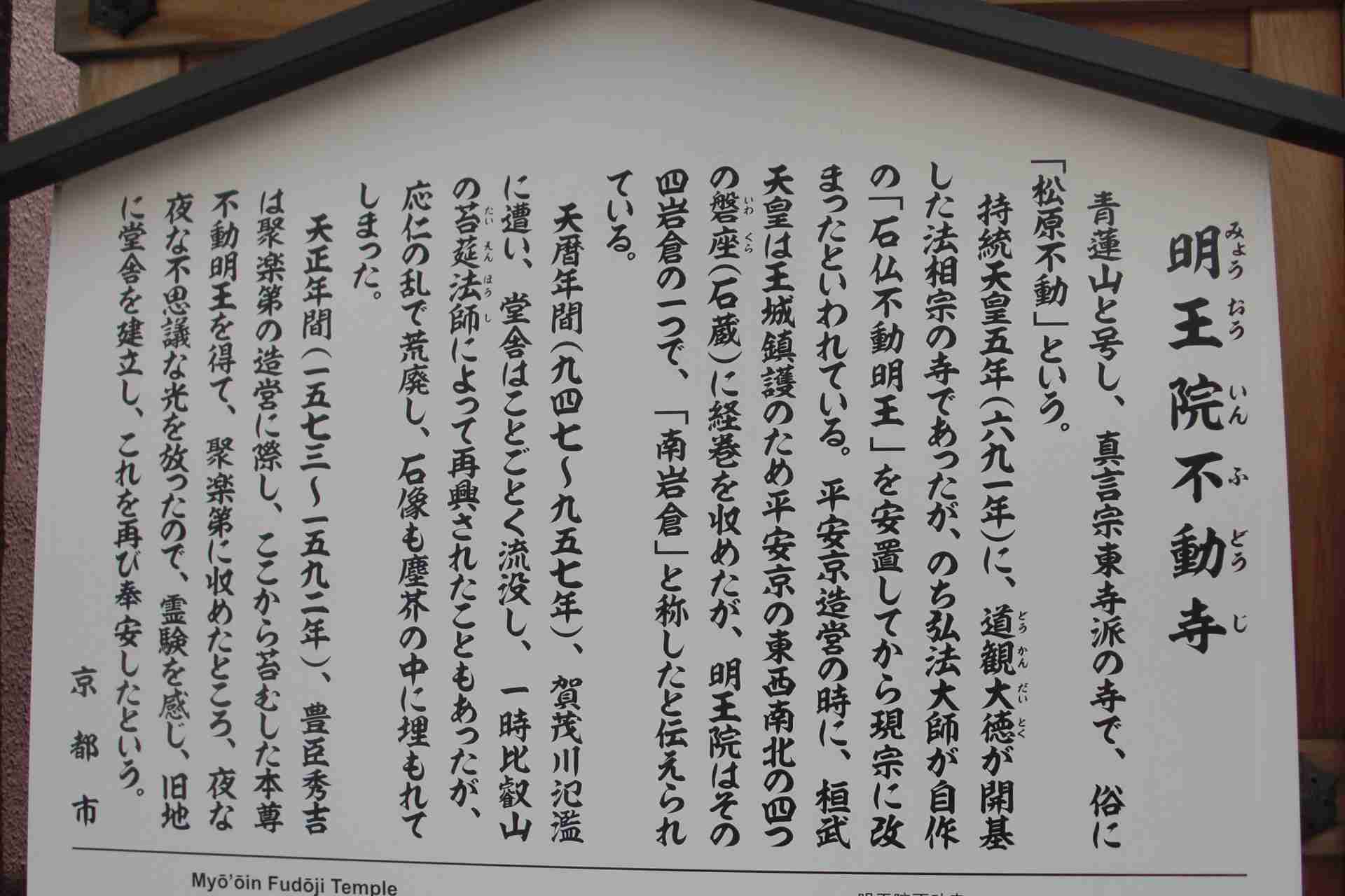 | 手前が「麩屋町通」、右(へ走る)が「松原通」。 | 「南岩倉」の扁額で不動信仰がわかる | 京都市設置の「案内板」。 |