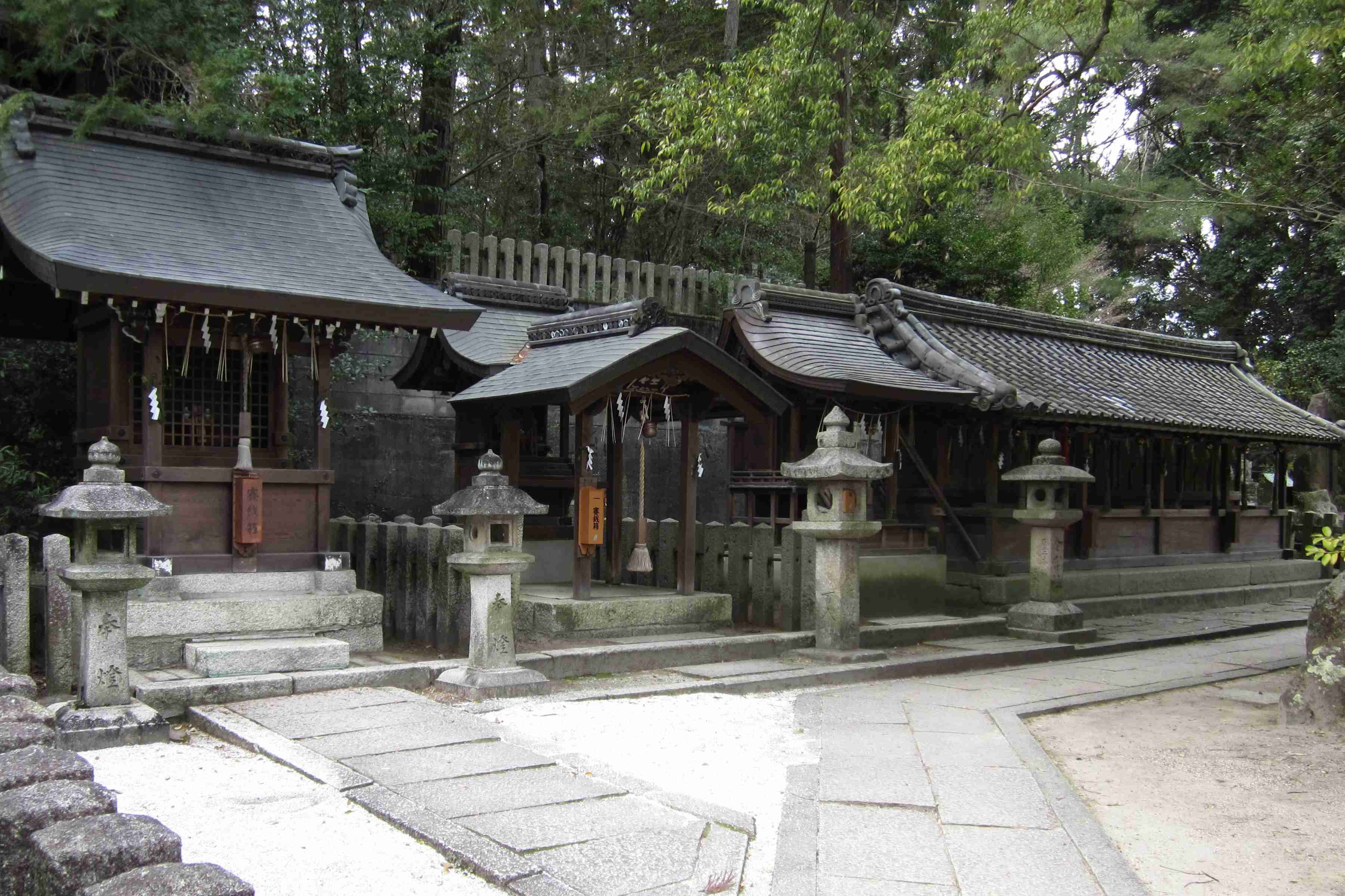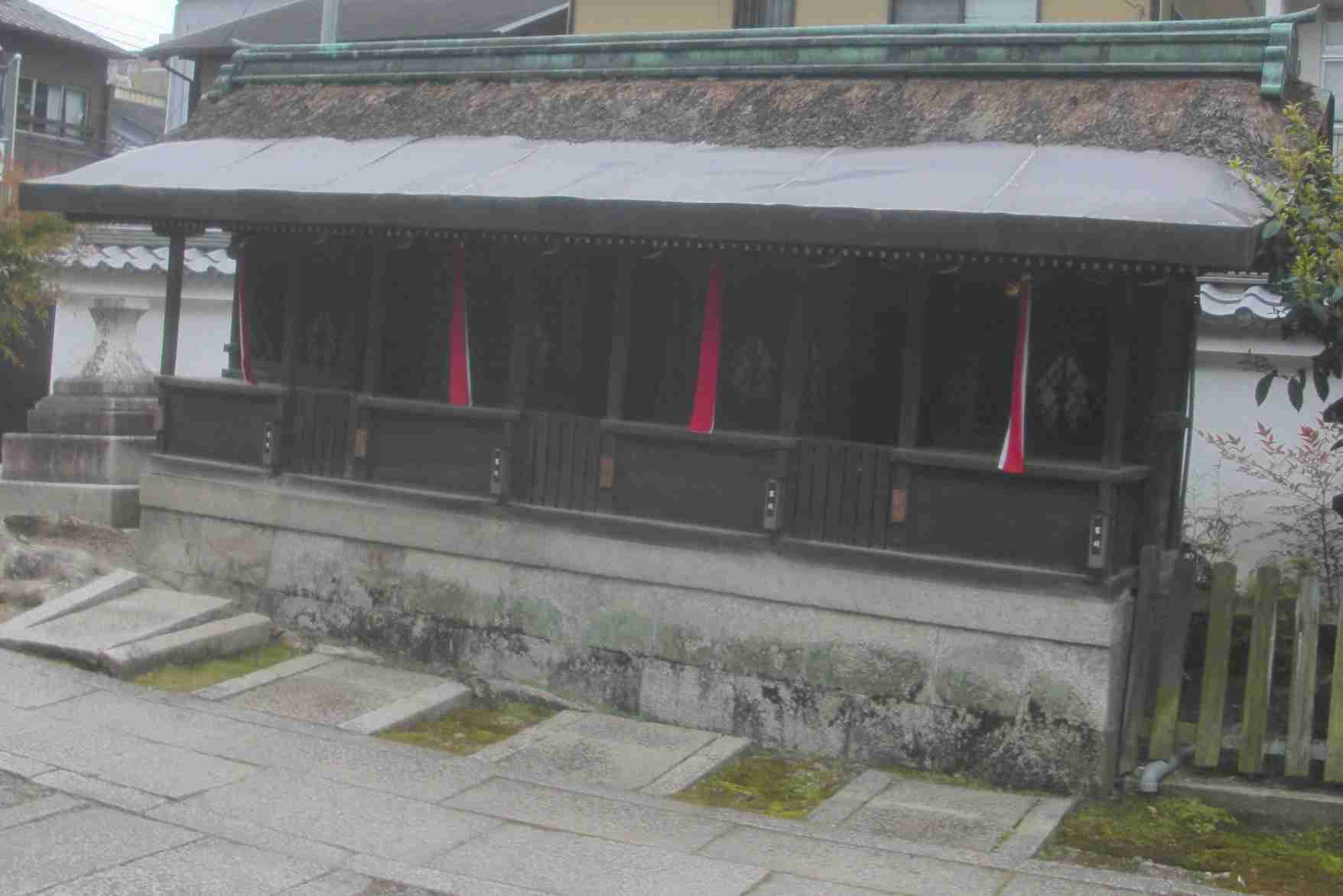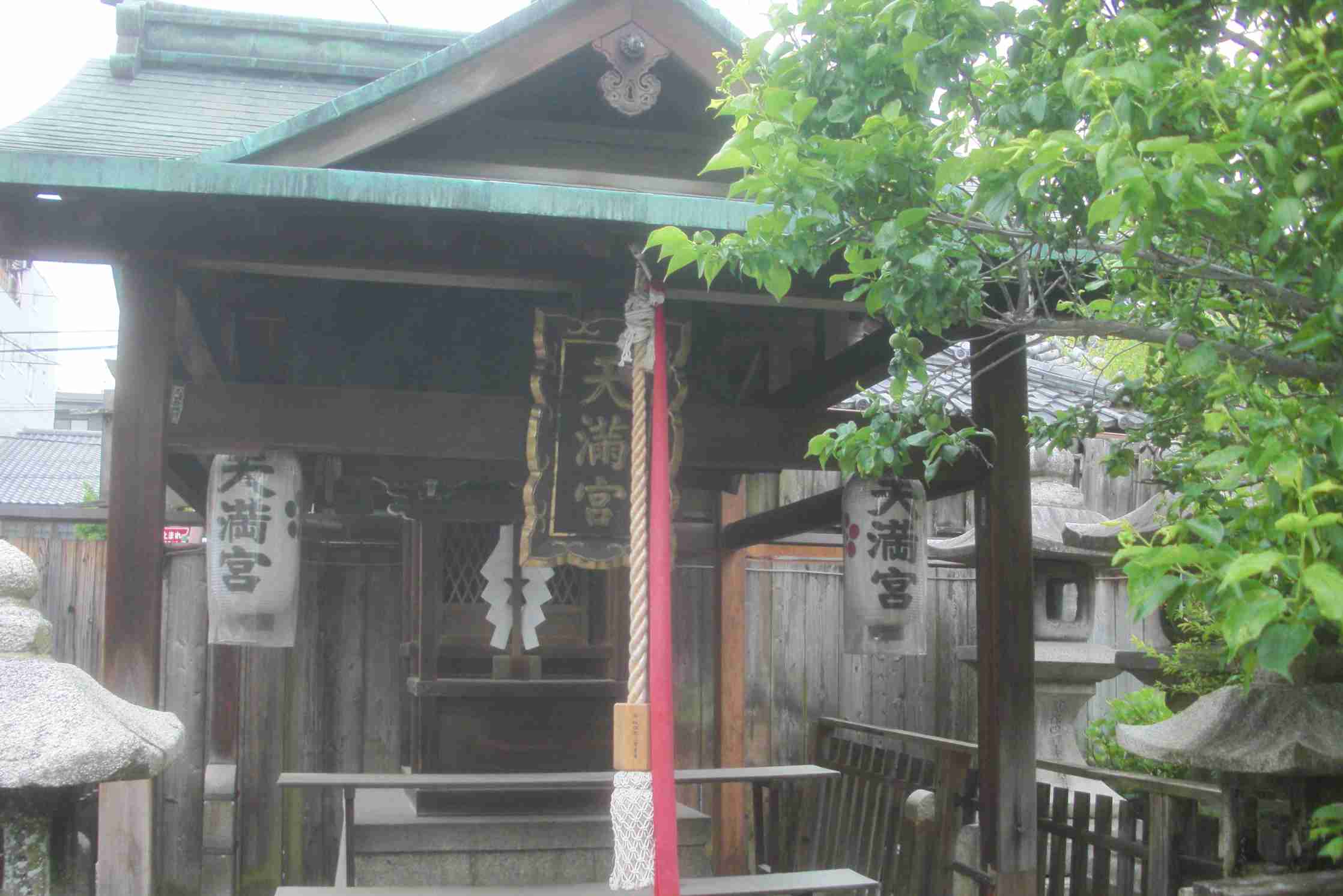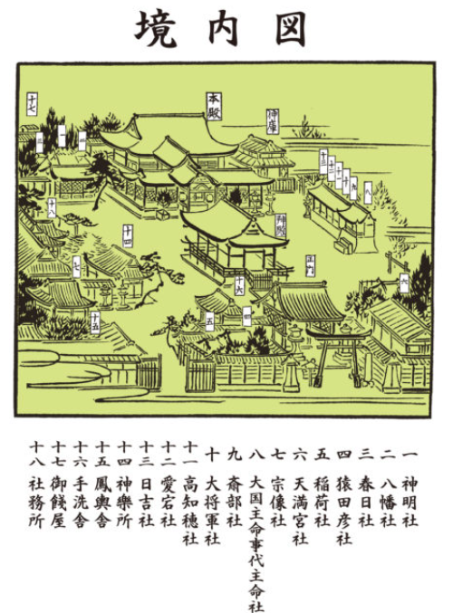 | 公式サイトに掲載されている「境内図」。末社の状況がよくわかる。 | 正門の右隣にある「末社 天満宮社」。 | 五社相殿社となっている「斎部社、大将軍社、高知穂社、愛宕社、日吉社」。 |