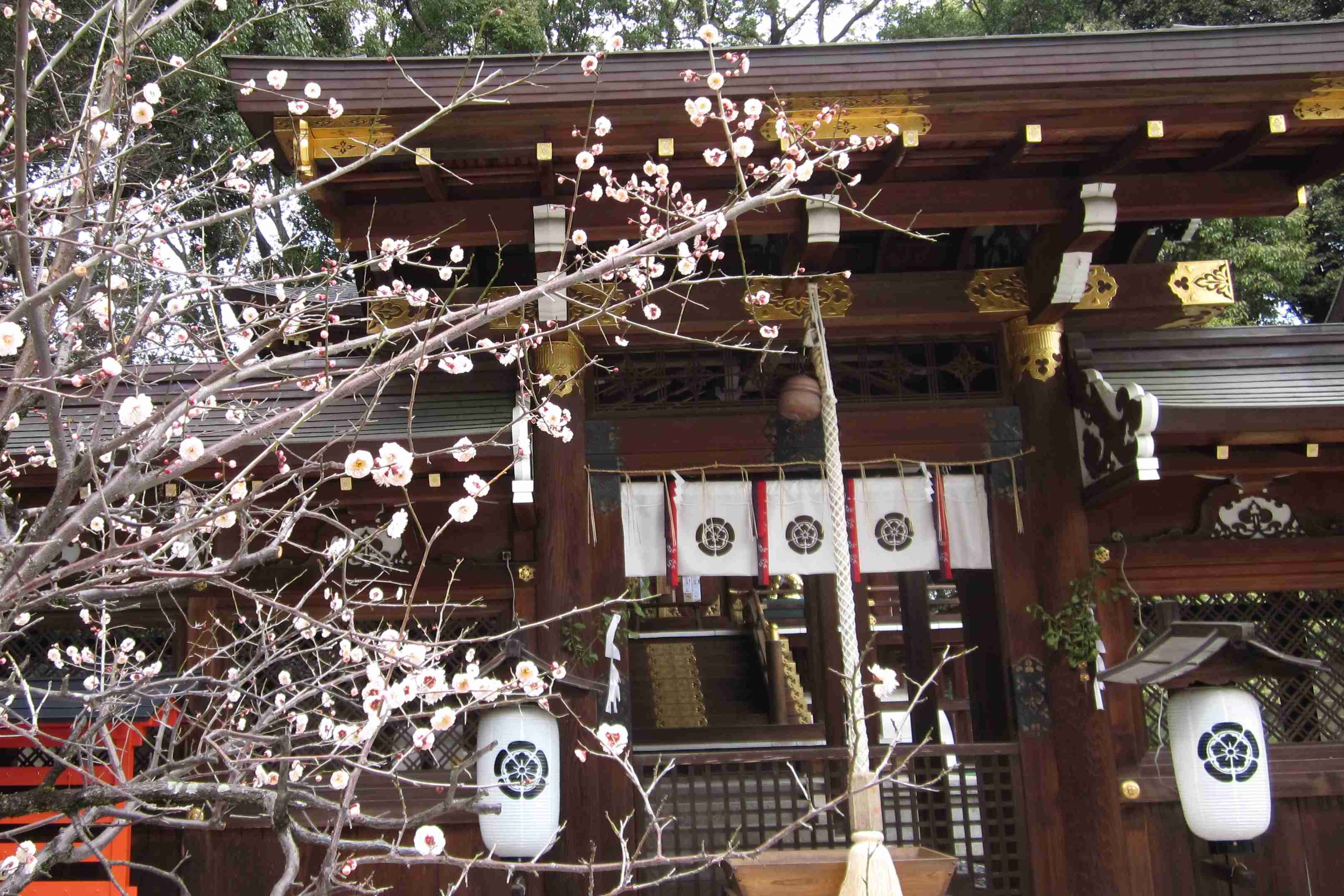 | 「神門」。今出川通に面している。正門の先に見えるのが「拝殿」。 | 「拝殿」の左に「鞠庭」、前に「右近の橘(左)と左近の桜(右)」(造りが御所に似ている)がある。 | 境内北東の「潜龍社」には(今でも飲める)「飛鳥井」、その奥に天然記念物「小賀玉」が見える。 |