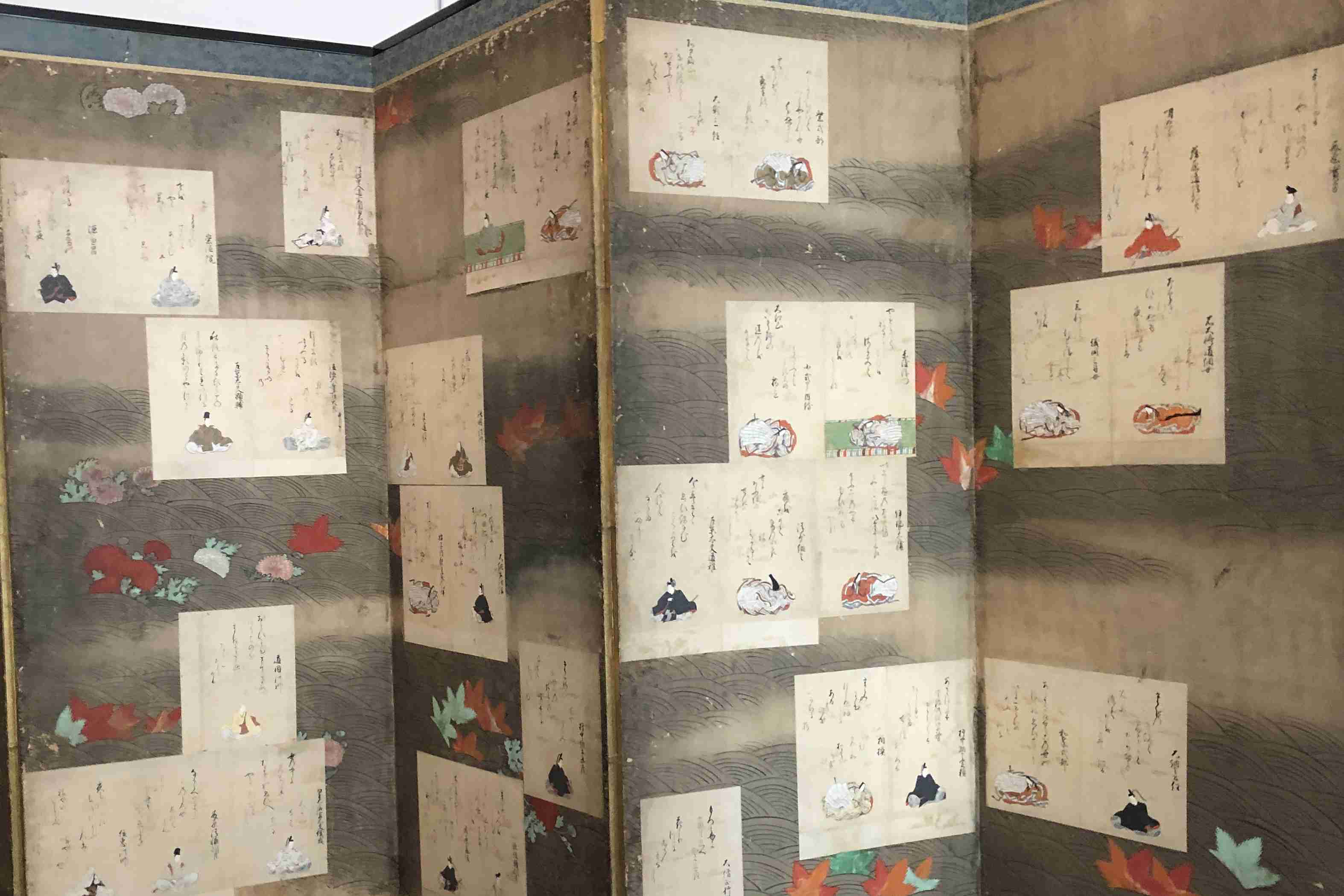 | 江戸時代はこういう風に貼られていた(と考えていたか、国立国会図書館所蔵) | 関連のある「4首組」で貼って欲しかったと主張している | 伝統産業ミュージアムに展示されていた。現代風に詠み手の「名前と肖像」が描かれている |